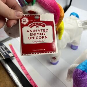 Gemmy lot of two shimmy unicorn, animated and musical, dances to Jingle Bells parody. Unicorn with tags has an issue with the gears, plays music as it should but gets gears stuck randomly in the song. Unicorn without tags works as it should with movement and music. Listing comes with both pieces, selling as a lot will not separate.
