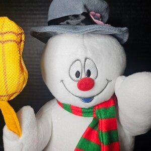 This adorable Gemmy plush Frosty The Snowman has a red embroidered G on his left foot. When you push that G he sings the song Frosty The Snowman. He is clean, free of stains and works great. See my video where he is singing. Takes three AAA batteries that I will include, so it's ready to use. He measures 13 inches tall. In very nice pre owned condition. Previous owner cut the tush tag, but he can be identified by the embroidered G for a Gemmy on his foot. Non smoking, pet free home. #GT TOTE