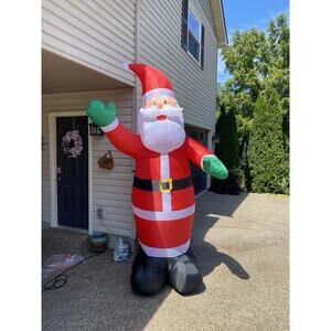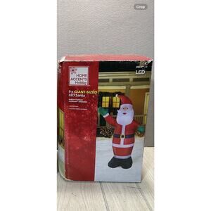 The Gemmy Home Accents 9 Ft Giant-Sized LED Santa Airblown Inflatable is a novelty outdoor decoration perfect for Christmas festivities. This inflatable Santa Claus figure features bright LED lights for added holiday cheer. Made of durable fabric and measuring 9 ft tall, this outdoor lawn decoration from the Gemmy brand is sure to be a centerpiece of your seasonal decor. Perfect for creating a whimsical and festive atmosphere in your yard, this Santa inflatable is a fun and colorful addition to your holiday celebrations.
