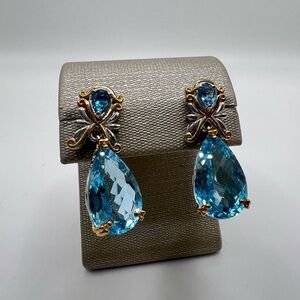 Elegant Gems en Vogue dangle earrings featuring brilliant blue topaz gemstones in a teardrop design. Crafted in 18K gold plated sterling silver and palladium, combining durability with timeless style.
