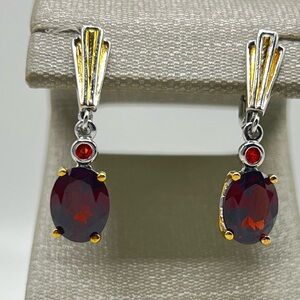 Elegant Gems en Vogue earrings featuring vivid oval-cut garnets in a dangle design. Crafted in sterling silver with 18K gold-plated accents, these earrings combine timeless beauty with a touch of luxury.