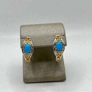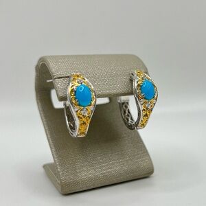 This exquisite Gems en Vogue earring features Sleeping Beauty Turquoise accented by White Sapphire. Crafted of 18K yellow gold embraced sterling silver and palladium with a beautifully-constructed undergallery, this earring shines with a highly polished finish.