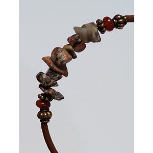 Brown leather cord bangle featuring natural jasper chip beads, accented with brass-toned spacers and red bead details.