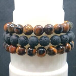 Gemstone Bracelet Tigers Eye Set of 3 Black Lava 8mm Beaded Handmade Stretch NEW