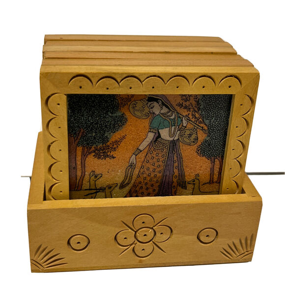 Gemstone Coasters From India Gem Stone & Wood Set Of 6 Hand Carved Set.