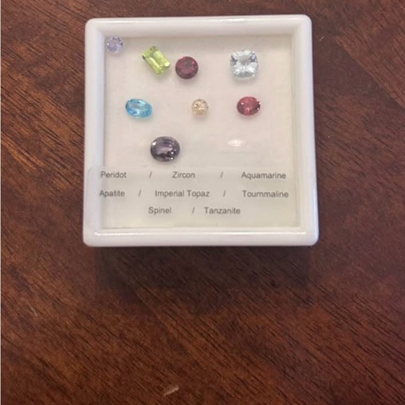 Elegant gemstone collection in a display case. Features peridot, zircon, aquamarine, apatite, imperial topaz, tourmaline, spinel, and tanzanite. Perfect for collectors.
