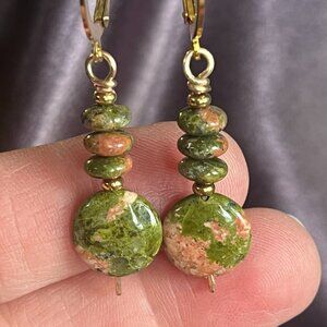 These lovely handmade earrings feature the natural beauty of Unakite gemstones, known for their warm soothing blend of mossy green and soft pink tones. Each polished bead displays unique earthy patterns, accented by gold-plated beads and secure lever back hooks for a comfortable, elegant finish.