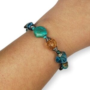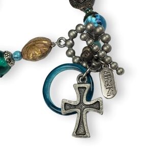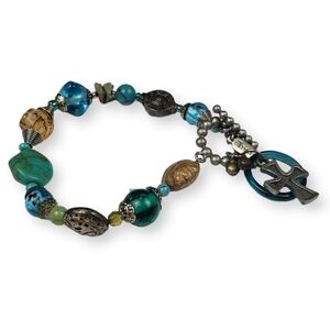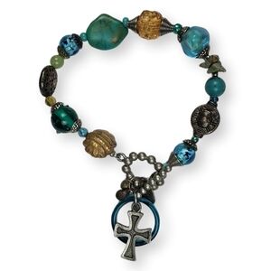Colorful beaded bracelet featuring blue, green, and amber glass, faux turquoise, and silver tone beads with a cross charm on the adjustable toggle clasp