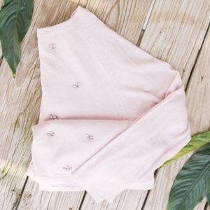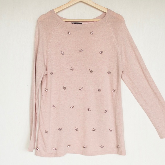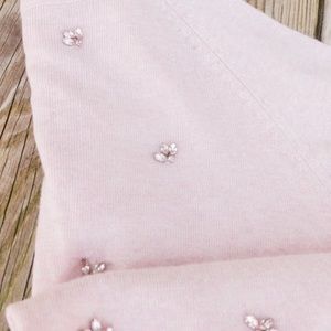 Sewn on jewels with open back (chiffon lining). Very pretty and elegant. Do not machine wash or machine dry. Lightweight sweater. Worn once!
