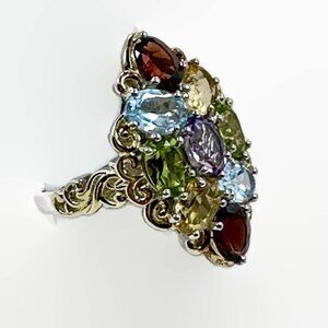 Absolutely beautiful gemstone ring! This is one of the prettiest rings that I have run across. It comes from the designer Chuck Clemency. It is a multi gemstone sterling silver and gold accented vintage ring. There is a rainbow of color with the 5 types stones. They include green peridot, purple amethyst, red garnet, yellow citrine and blue topaz. It is a beautiful color combination. Each stone is prong set. The setting rises up from your finger to let more light into the stones. Now look at those gold vermeil accents. The flowing metal is so pretty. This is a hard to find larger size. Great piece for your index finger or those with a size 10 finger. You will not regret getting this piece!