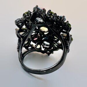 What a beautiful, unique ring! It is a large multi stone sterling silver vintage ring. It is just gorgeous! The stones include blue topaz, green peridot, tourmaline, yellow citrine and all. All of the stones are faceted for sparkle. They are prong set. The sterling has a black finishes with really makes the stones pop. Gorgeous statement piece for your hand!