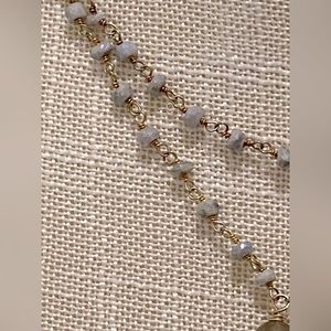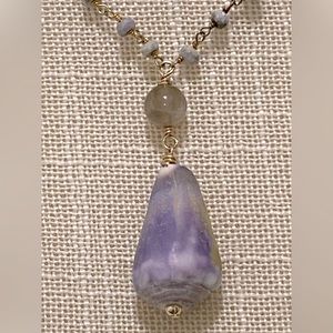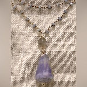 Gemstone chain of gray silverite moonstone with a beautiful natural purple Hawaiian shell. Maker is Earthyluxe. Measures 32” and pendant is 1 3/4”. Her designs are very versatile and can be worn dressed up or dressed down.