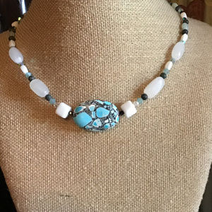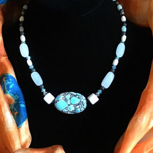 One of a kind large 15mm x 20mm Magnesite stone centered and surrounded by Jade , Quartz & Jasper. Highlighted with turquoise, jet & clear Swarovski Crystals and finished with sterling silver clasp. 16"L