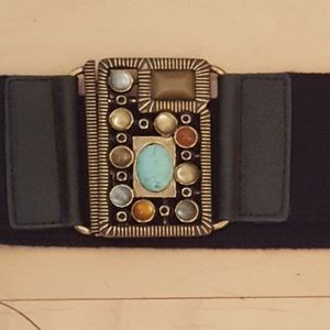 One-of-a-kind black gemstone belt with dark gold hardware and black leather accents. Stretch fabric so it cinched your waist and can be added to a variety of outfits.