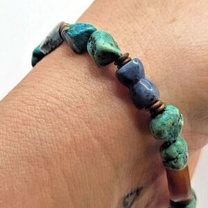 Gemstone Dyed Howlite Green Veined Agate Lapis Chalcedony 7in | Materials: dyed howlite, green veined agate, moss agate, lapis, chalcedony | Length: 7in | Clasp: stretchy | Signed? no | Excellent vintage condition