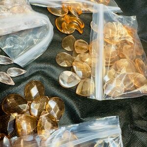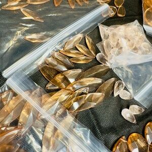 A large lot of similar colored gemstones for jewelry making. Yellow citrine quartz and champagne colored Czech glass appear to be types. The shapes include healer/moon shaped, flat and cylindrical teardrop, small and large leaf. These are all ready to be placed in jewel settings.