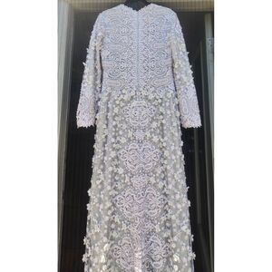 - Sleeves: Long, fitted, semi-sheer lace with floral appliqués