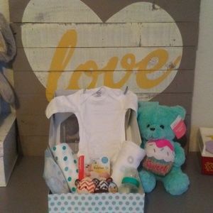 2 NB long sleeve onesies, 2 Receiving blankets 100% cotton- by lulujo- white/blue polka dots and white with blue/grey whales!! 1 Infantino foot rattle set, 2 NB honest diapers in bag, 1-4.oz evenflo BPA free bottle, 1 plush bear with cupcake "My mom's Sweet". Comes in blue polka dot gift box. Sweet for a mom-to-be.