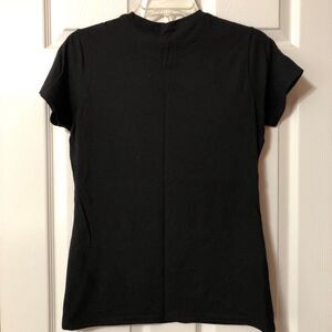 Black, 100% Cotton, has some stretch but not built into the fabric, short sleeve, wore once.