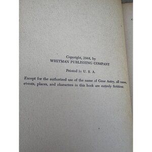 This vintage hardcover book features a Western adventure starring Gene Autry. Published in 1944 by Whitman Publishing, it is a collectible piece of classic fiction.