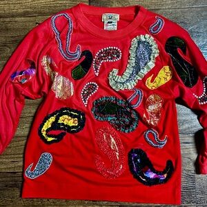 Gene Ewing Bis ~ Small ~ Red W/Multi-Colors Beaded & Embroidery Paisley Sweater