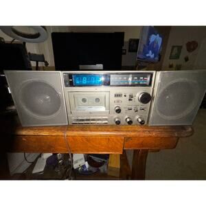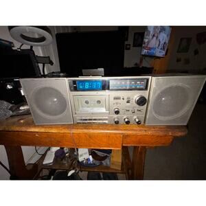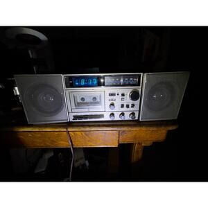 Vintage General Electric 7-4990A AM/FM Stereo Clock Radio Cassette Recorder – For Parts/Repair This listing is for a vintage General Electric Model 7-4990A AM/FM stereo clock radio cassette recorder. The unit features a wood-grain finish on polystyrene, dual speakers, a cassette deck, and a digital clock display.
