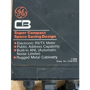 Vintage General Electric 3-5808A CB radio with microphone. Features include electronic RX/TX meter, public address capability, built-in ANL noise limiter, and rugged metal housing. Compact, space-saving design ideal for collectors or restoration projects. Unit is untested and sold as-is.