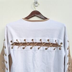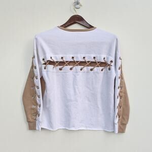 Features: sold out online, cotton blend, lace-up sleeve details, french terry fabric, banded ribbed cuffs, raw hem cut, brown, tan, white, sweater, pullover, revolve