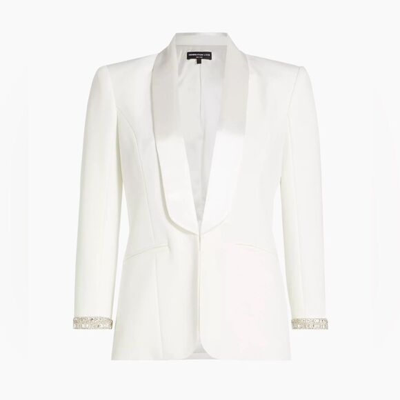 The Generation Love Argo Blazer features a satin shawl collar and crystal-embellished cuffs, showcasing a luxurious and glamorous style.