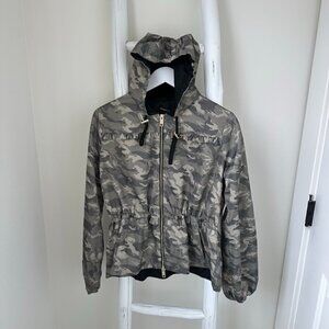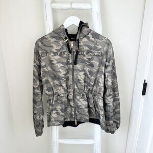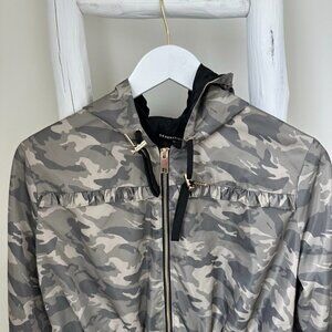 *camo windbreaker with ruffle detailing and gold hardware