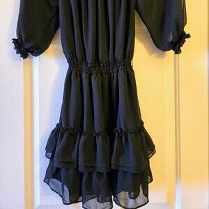 This dress is fully lined, has a stretchy scooped neck, and sheer sleeves to the elbow with an elastic cuff. It has gathered elastic around the waist are and ruffles on the bottom hem. It is very light and flowy and could be worn for many occasions. From the armpit to the gathered waist is approximately 8 inches and then to the bottom ruffle hem is approximately 14 more inches inches.