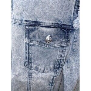 The Generation Love denim jacket in size medium features a solid light wash pattern, ruffle accents and a button closure. Made from a comfortable cotton blend outer shell, this casual yet trendy jacket is ideal for all seasons. It's a cute and versatile addition to any woman's wardrobe.
