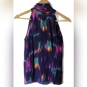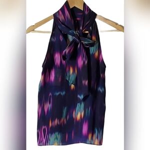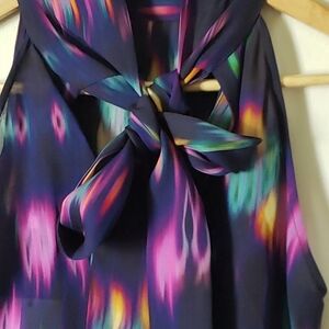 Gorgeous silk high blouse with tie feature. Creating a peekaboo look in back.