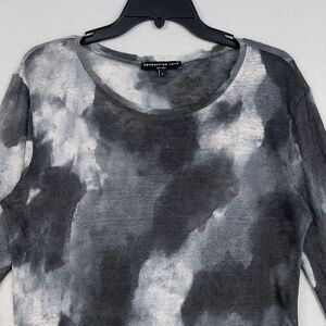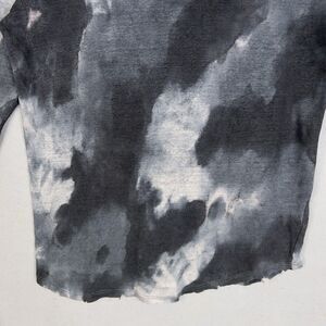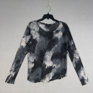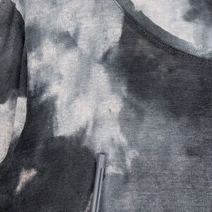 Features a tie dye pattern in shades of black, gray, and white. Long sleeve, scoop neck, with raw/slightly frayed neckline and hem.