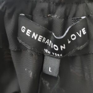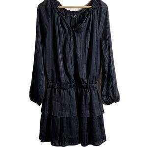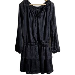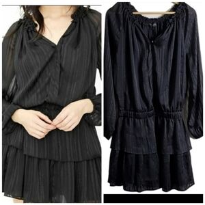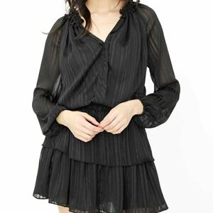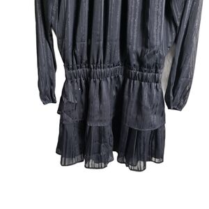 Women's metallic striped, elasticized long sleeve dress featuring double layer skirt with split neckline and ruffled details. Lined