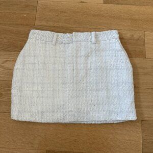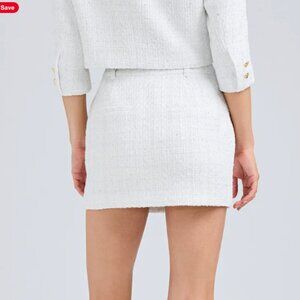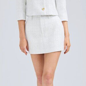 This white tweed micro miniskirt, discreetly lined with shorts, shimmers with sequin embellishments, enhancing its captivating appeal. Generation Love tweed is crafted with recycled fabric, imported from Italy.