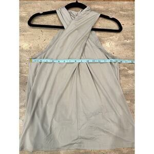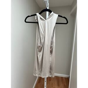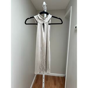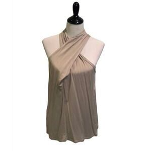 Lightweight, non-stretch silk charmeuse. Crisscross halter neckline. Buttons at back. True to size. Dry clean.