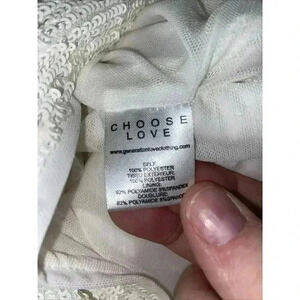 Self: 100% polyester.Lining: 95% polyester, 6% spandex. Made in China. Dry clean only. Hidden back zipper closure. Elastic waistband. Ruched sleeves. Tonal sequin embellishments throughout.