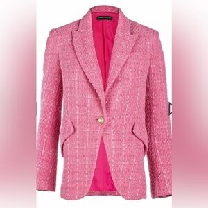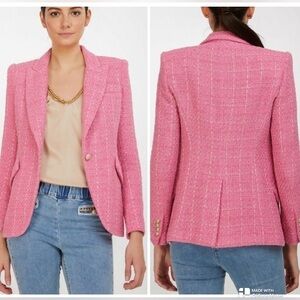 Single-breasted, tailored-tweed blazer features strong shoulders and slanted pockets for style that goes great day-to-night.