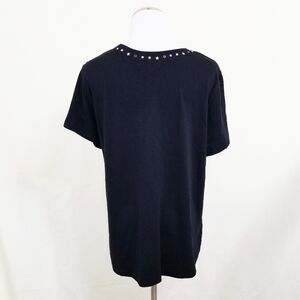 Generation Love studded black tee. Short sleeve t-shirt. Embellished collar and front pocket. Metal star studs, clear and black rhinestones. Scoop neck. Cotton modal blend. Simple with just a touch of rocker chic. Size large.