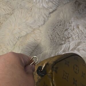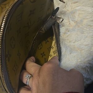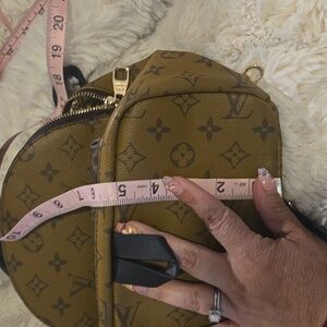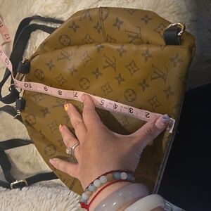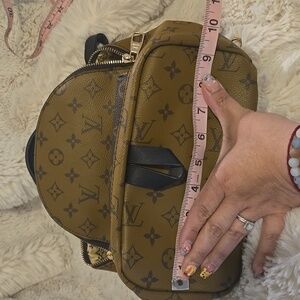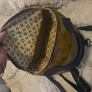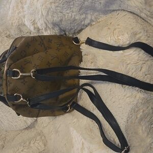 Stylish Generic Lou. V..... Mini Backpack, crossbody, sling brown/tan. Mirror image. Features 2 black removable straps. Fabulously Chic reverse monogram paln springs mini backpack. Please look to the pictures that follow for dimensions. Bundle and save. Gently used, all purses are from smoke free, pet free and pest free home.