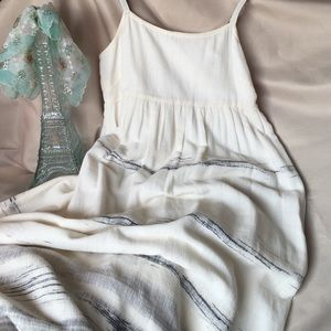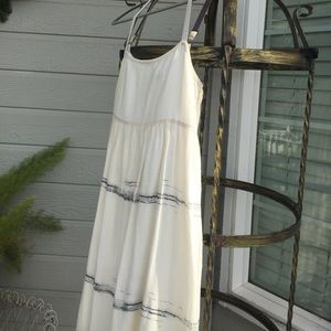 Breezy, understated and elegant sundress. Creme colored with ash horizontal lines that graduate toward vivid at the hemline. Worn once. Well cared for in a pet/smoke free home. The straps are adjustable and wide enough for comfort but dainty enough to escape a more matronly look. Very pretty.