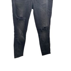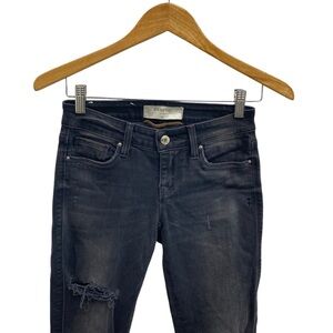 Features a low rise, stretch denim, dark grey/black shade with knee and thigh rips, zip fly and button closure. Excellent preowned condition, no flaws.