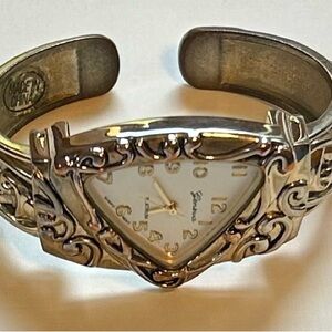 Stylish Geneva quartz watch with intricate detailing. Fresh battery, keeps accurate time. Slight wear on the ends of the bracelet. Spring band allows for different wrist sizes. Adds elegance to any look.