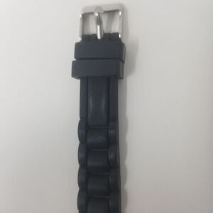 This Geneva Black Silicone Strap Gemmed Bezel Women's Watch is in excellent used condition. The watch has never been worn since the buckle holes are not punched out. The watch is untested and needs a new battery. This black silicone wristwatch has a black face with silver large easy to read numerals. This gemmed watch has a second hand and it is easy to clean, so it would be a great gift for a nurse. This women's wristwatch has a silver gemmed bezel and a black adjustable strap with a buckle closure. This watch is perfect for all occasions, formal or casual.