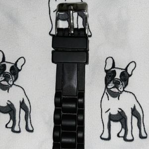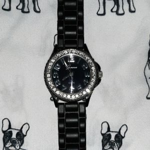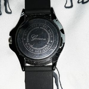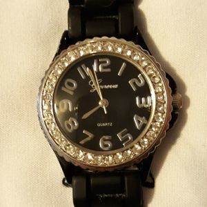 This is a nice looking watch, its good a black rubber band, a silvertone & back metal case with faux diamonds encircling the face. Silver numbers with Geneva & quartz on the face. The back of the case has a dent but since that faces your wrist, nobody will know. Has scratches and wear consistent with use.