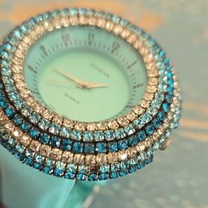 Stylish Geneva watch with sparkling blue rhinestones. Matching adjustable silicone band. Will fit 6.5-8.5" wrist. Perfect for adding a touch of glamour. Please note that there are two stones missing but not noticeable when worn. Works as it should but will need a new battery. Smoke-free home.