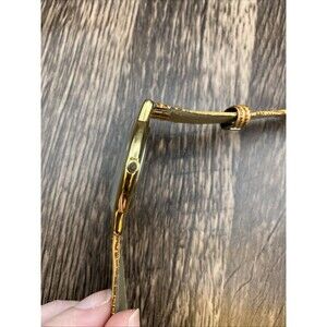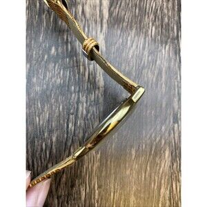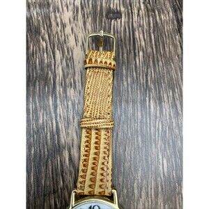 Gold tone case, easy read dial, leather like band, clear plastic still on face of watch, new battery
