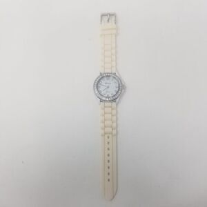 This Geneva Platinum 6886 Women's Watch is in good used condition. It is untested and needs a new battery. It has a cream silicone band. The bezel is white, silver and rhinestones with one missing rhinestone in the bezel (see photos). There is some slight wear to the white plastic bezel (see photos). The case backing is stainless steel. The face is white with large silver numerals and a second hand. The band is cream colored with buckle closure to adjust to different wrist sizes.
