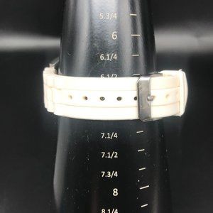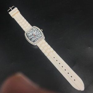 The watch features a silicone band that is comfortable and flexible, and a case that houses a dial with rhinestone accents. The watch is powered by a quartz movement and has a new battery installed.